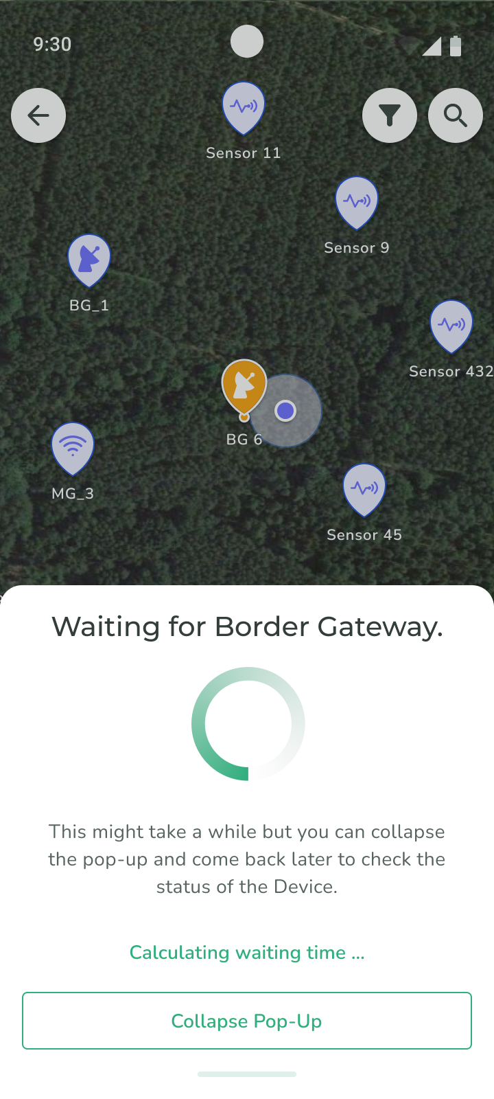 2. The Silvanet Cloud attempts to reach the Border Gateway. A popup dialog appears over the map with a progress indicator. This popup can be minimized by selecting **Collapse Pop-Up**.