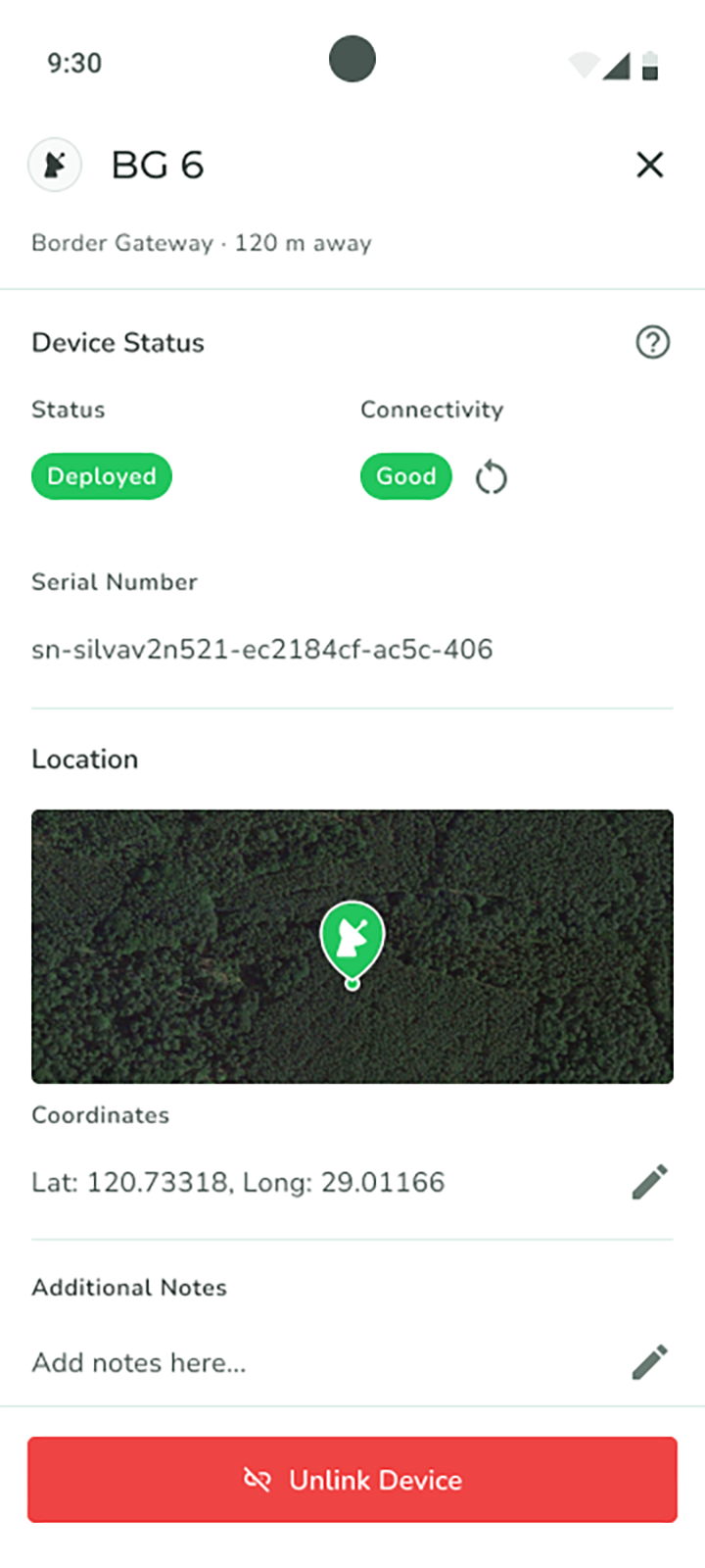 4. If you have tapped **Show Device Details**, the following screen appears. You can add additional information in the **Notes** field.