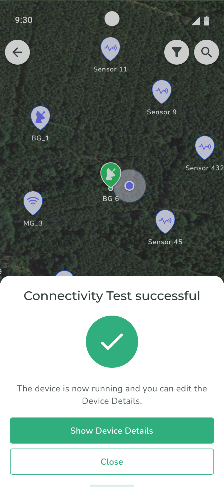 3. If the Silvanet Cloud could reach the Border Gateway, a **Connectivity Test successful** message appears. Tap **Show Device Details** or **Close** to dismiss the popup dialog.