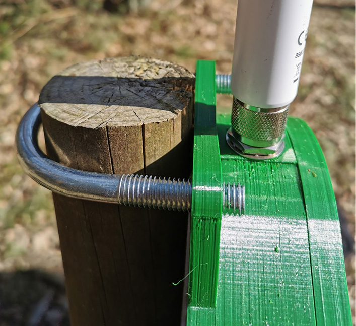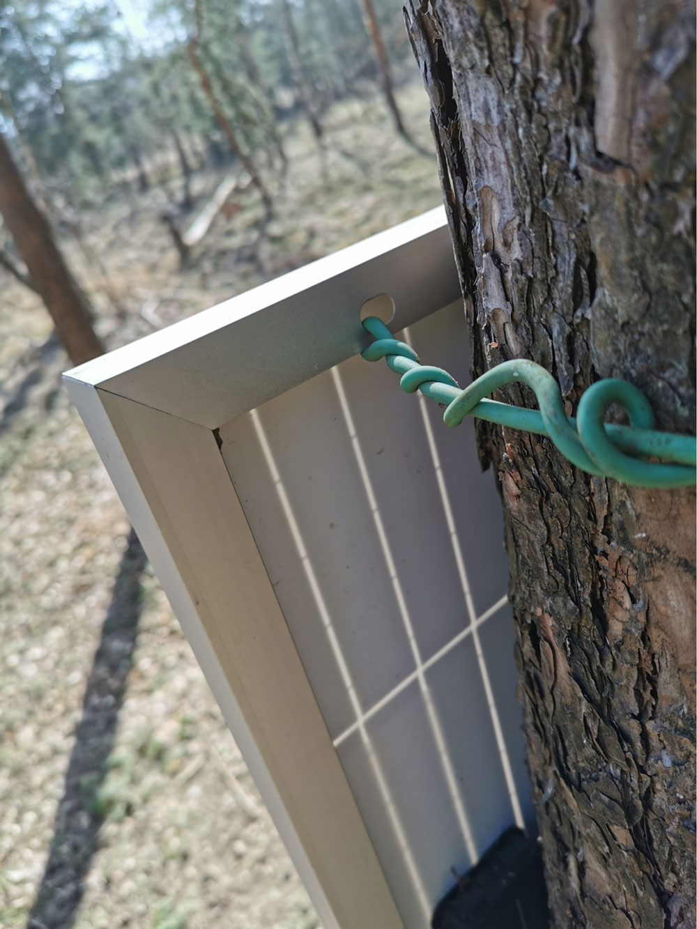 After attaching the Border Gateway to either a pole or a tree, the solar panel needs to be attached to the same location, preferably above the Border Gateway. Garden wire is used to secure the solar panel to the support structure (tree or pole).