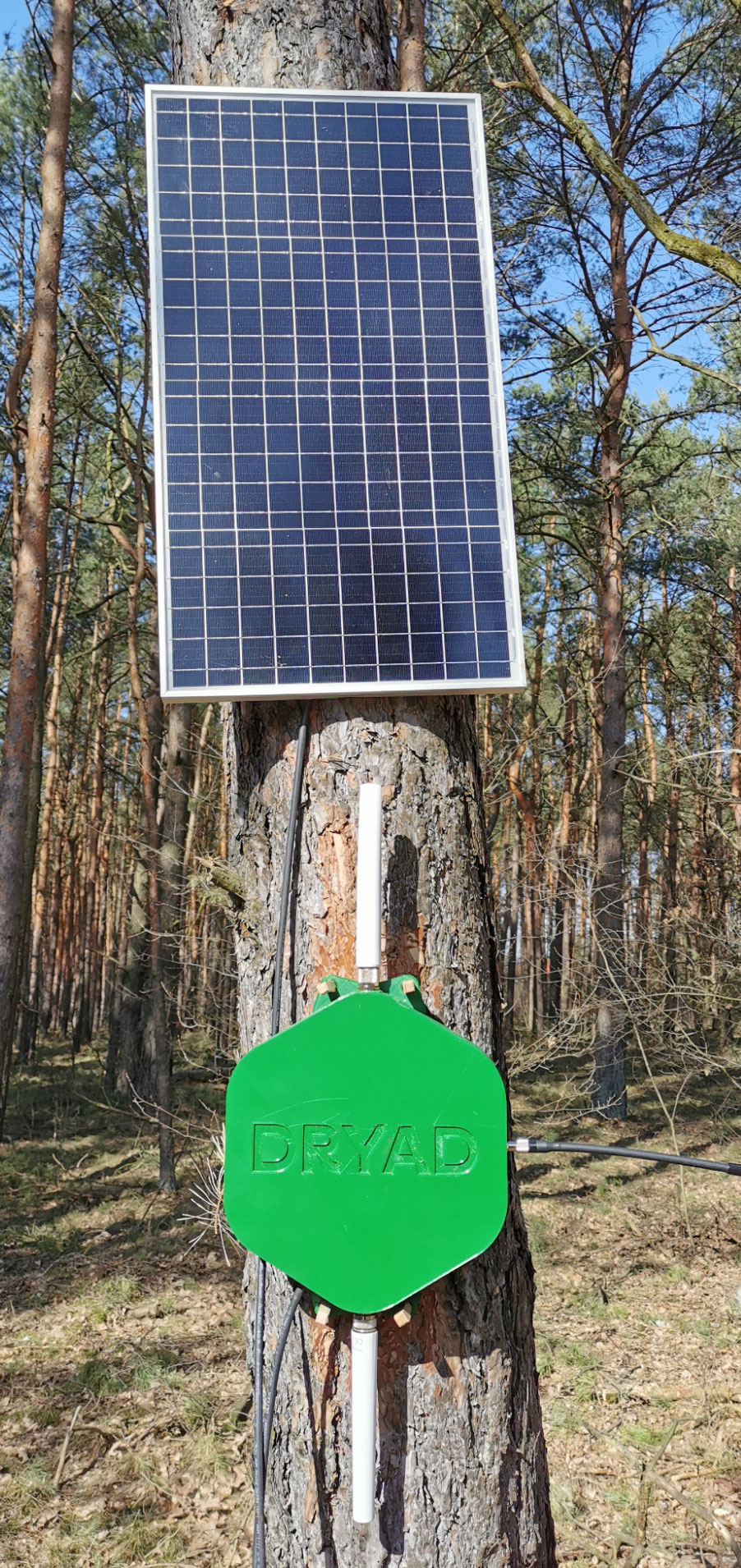 Attach the solar panel to the tree above the Border Gateway. And if used, connect an Ethernet cable from a router. See below.