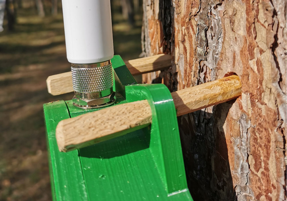 Remove any branches and other obstructions at the deployment height. This allows the solar panel to have good irradiation from the sun to charge the device. Carefully remove a small portion of the bark with an axe or chisel where the holes in the tree will be drilled. This allows the gateway to hang vertically on the tree.