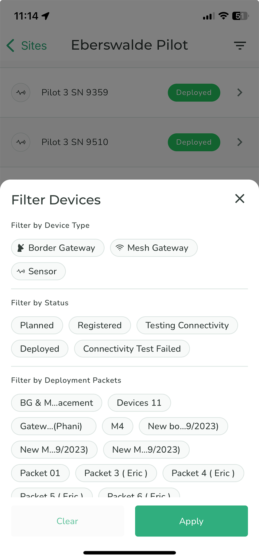 Tap a filter, then top **Apply** to view only the selected devices in the list. To view all devices again, tap **Clear** which clears the filter.