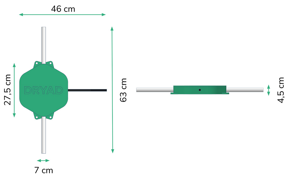 The dimensions of the Silvanet Border Gateway are (LxWxH) 27.5 cm (63 cm with antennas) x 46 cm (with the satellite antenna) x 4.5 cm and weighs 1.3 kg.