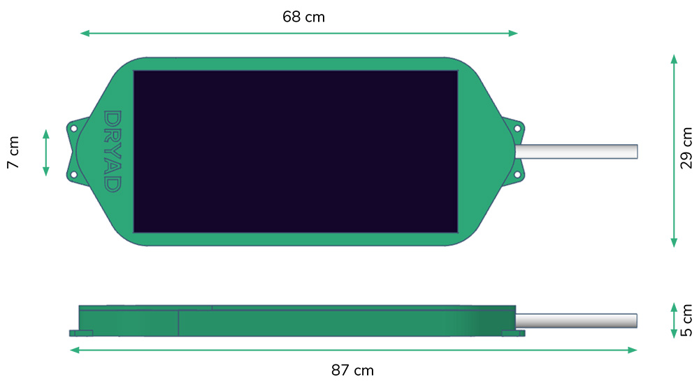 The dimensions of the Silvanet Mesh Gateway are (LxWxH) 68 cm (87 cm with antenna) x 29 cm x 5 cm and weighs 2.8 kg.